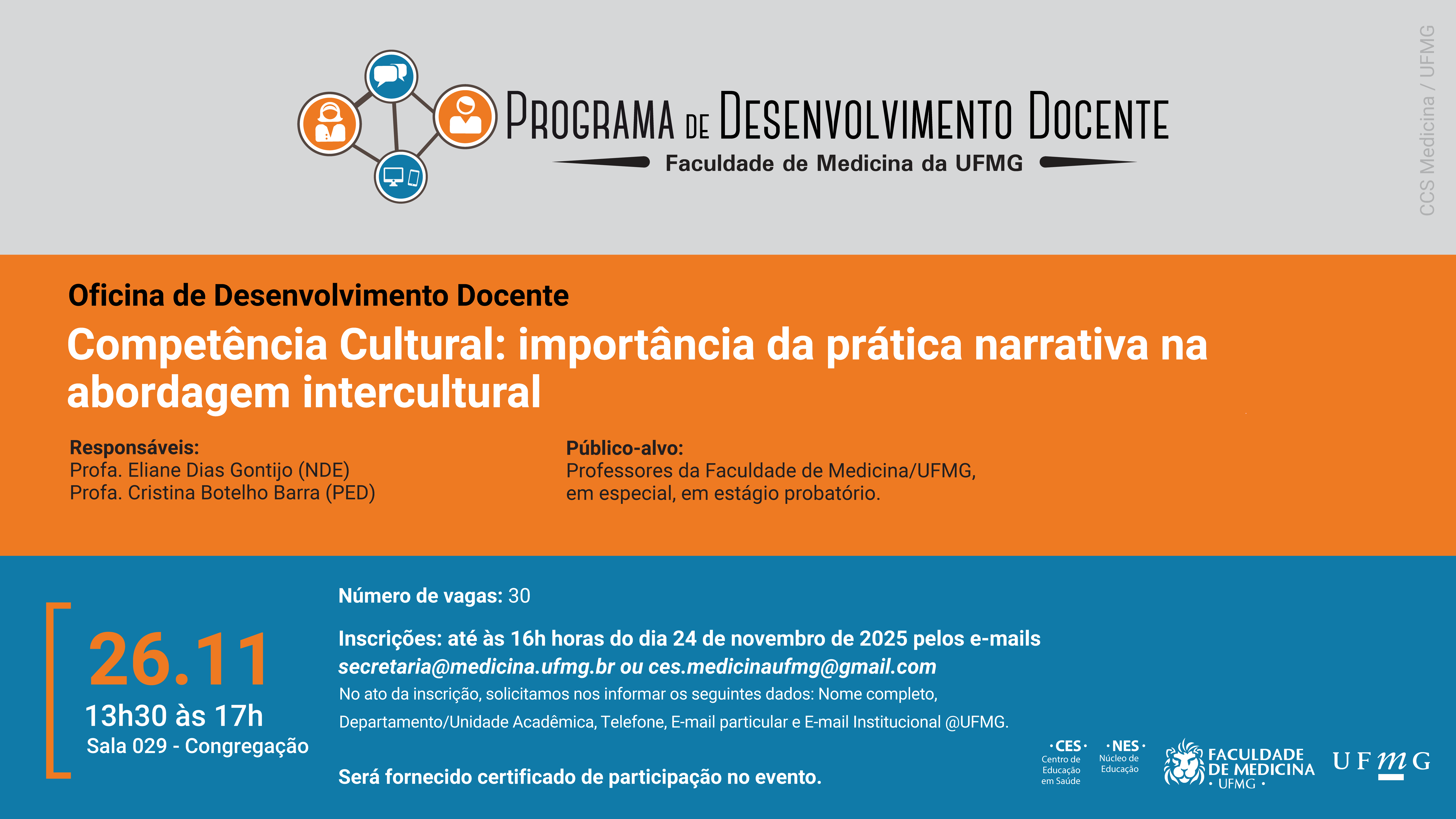 A Oficina Docente “Competência Cultural: importância da prática narrativa na abordagem intercultural”, realizada pelo Núcleo de Educação da Faculdade de Medicina e parte do Programa de Desenvolvimento Docente, acontecerá no dia 26 de novembro de 2025, 13h30 às 17h, na sala 029, Congregação da Faculdade de Medicina.