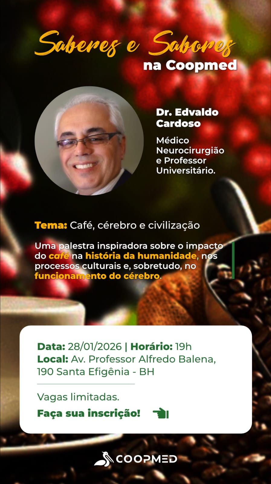 Acontece amanhã, dia 28 de janeiro, o encontro Saberes e Sabores, com a presença do Dr. Edvaldo Cardoso, médico cirurgião e professor universitário. Com o tema: Café, cérebro e civilização. A conversa será inspiradora sobre o impacto do café na história da humanidade, nos processos culturais e sobretudo, no funcionamento do cérebro.