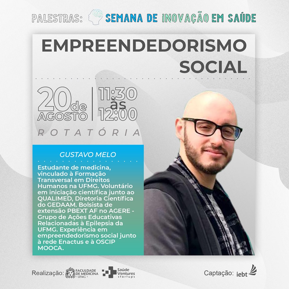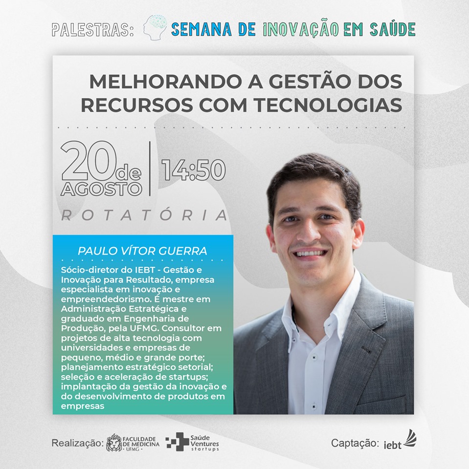 Outra atividade, que contará com transmissão online, é o Seminário de Inovação e Saúde Pública, que ocorre no dia 21, das 8h às 12h, no Salão Nobre. O objetivo é inspirar pessoas interessadas em empreender na área da saúde com enfoque no SUS, mas válido também para a rede particular. Para isso, participam representantes de órgãos com relevância na área, como da Coordenação de Pesquisa Clínica em Produtos para a Saúde da Agência Nacional de Vigilância Sanitária (Anvisa), da Fundação de Amparo à Pesquisa do Estado de Minas Gerais (Fapemig), do Departamento de Ciência e Tecnologia (Decit) do Ministério da Saúde, além de professores da Faculdade.