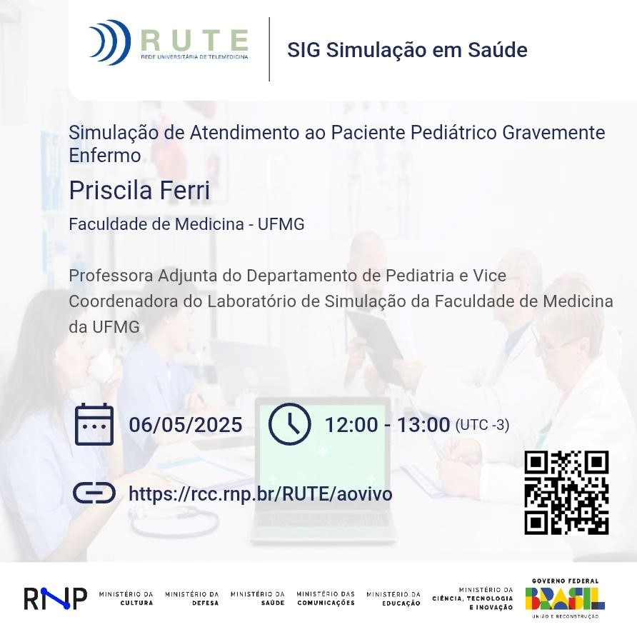A Faculdade de Medicina da UFMG e a Rede Universitária de Telemedicina (RUTE) promovem a web palestra: “Simulação de Atendimento ao Paciente Pediátrico Gravemente Enfermo”, ministrada pela professora Priscila Ferri, Faculdade de Medicina – UFMG. O evento acontece no dia 06 de maio de 2025, de 12h às 13h.