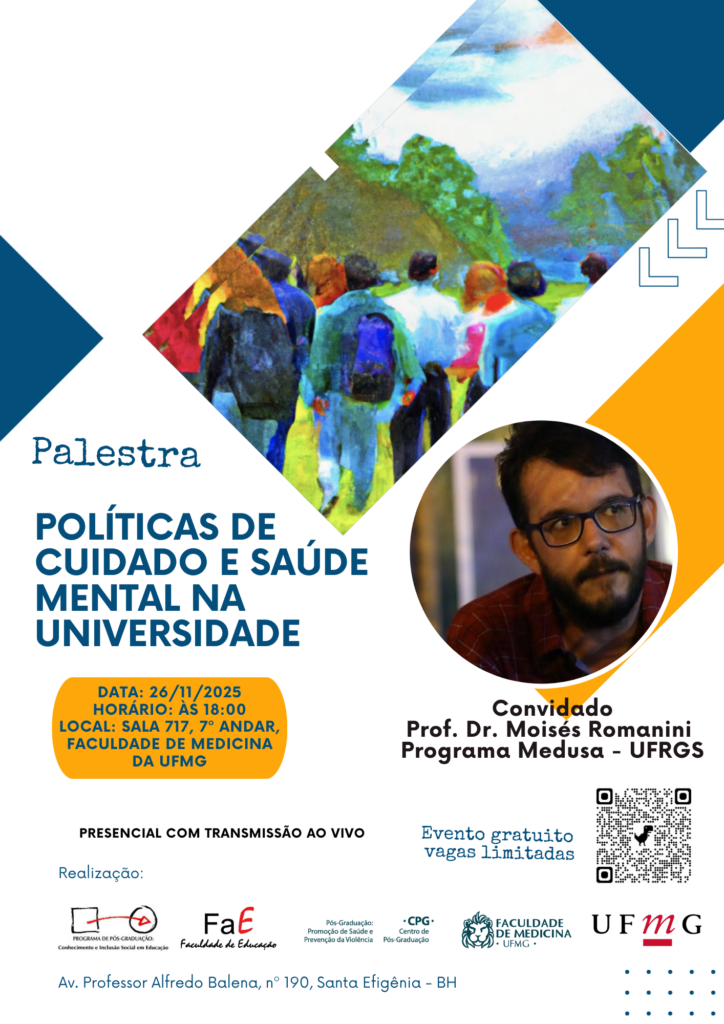No dia 26 de novembro de 2025 acontecerá a palestra “Política de Cuidado e Saúde Mental na Universidade”, ministrada pelo professor da Universidade Federal do Rio Grande do Sul, Moisés Romanini. O evento acontecerá na sala 717 – 7º andar da Faculdade de Medicina da UFMG, às 18h.