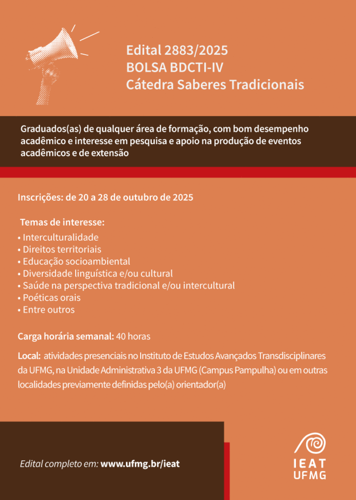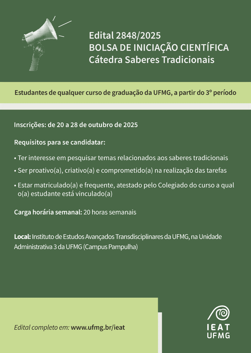 O Instituto de Estudos Avançados Transdisciplinares (IEAT) da Universidade Federal de Minas Gerais (UFMG), no âmbito do Programa Cátedra Saberes Tradicionais do IEAT/UFMG, faz saber à comunidade universitária que, no período de 20 a 28 de outubro de 2025, estarão abertas inscrições para seleção de 01 (um) estudante de graduação para atuação como bolsista de