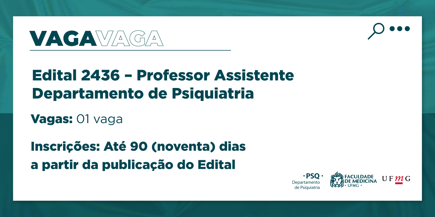 Está aberto o edital para o preenchimento de uma (1) vaga destinada ao cargo de professor Assistente nível 1 do Departamento de Psiquiatria. Os candidatos interessados têm até 90 (noventa) dias a partir da publicação do Edital para realizar às inscrições (Conferir edital).