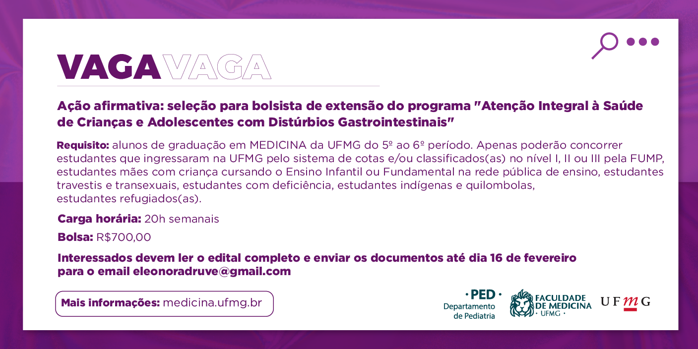 A Faculdade de Medicina da Universidade Federal de Minas Gerais abre inscrições para 01 (uma) vaga para atuação no Programa – ATENÇÃO INTEGRAL À SAÚDE DE CRIANÇAS E ADOLESCENTES COM DISTÚRBIOS GASTROINTESTINAIS, sendo uma bolsa de extensão na modalidade PBEXT AÇÃO AFIRMATIVA.