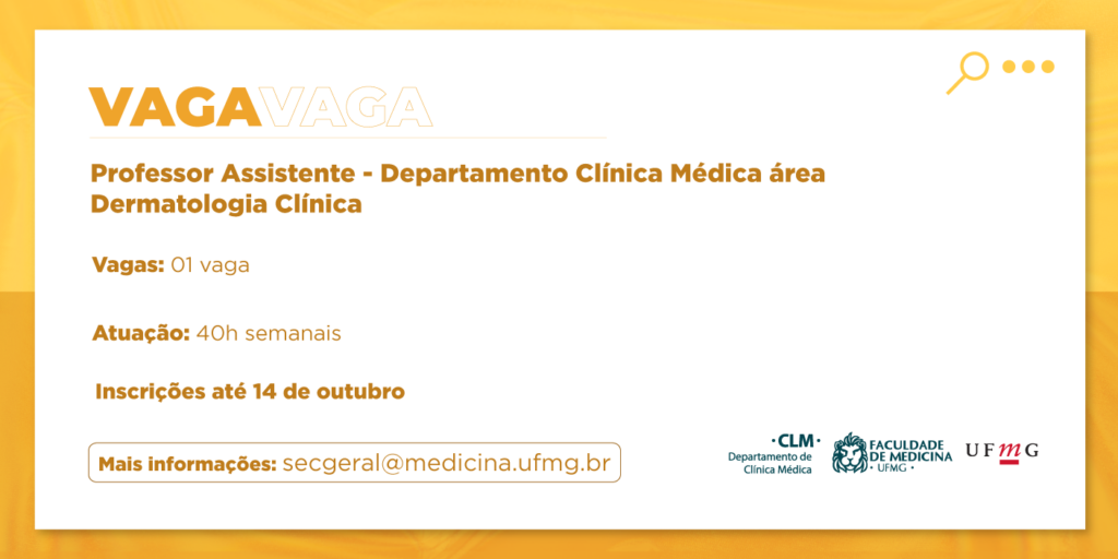O Departamento de Clínica Médica da Faculdade de Medicina está com uma vaga aberta, para seleção de professor assistente na área de Dermatologia Clínica. O regime de trabalho é 40 horas semanais em tempo integral.