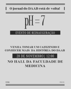 Após um longo hiato, o Jornal do Diretório Acadêmico Alfredo Balena (DAAB), o pH=7 anuncia seu evento de reinauguração no dia 28 de novembro às 12 horas, no hall da Faculdade de Medicina UFMG, aberto a todos.