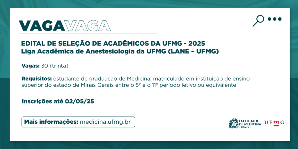 Estudantes do curso de graduação em medicina podem se inscrever, até 02 de maio, para participar da Liga Acadêmica de Anestesiologia (Lane) da Faculdade de Medicina da UFMG. A inscrição deve ser feita exclusivamente via formulário eletrônico, juntamente com a carta de intenção, que deve ser escrita de acordo com as orientações descritas no edital.