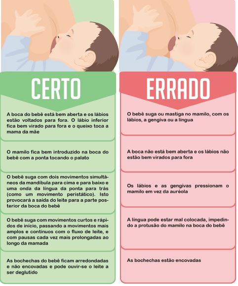 Durante a amamentação, a posição deve ser confortável para a mãe. Para saber se a técnica está sendo realizada corretamente, observe se: