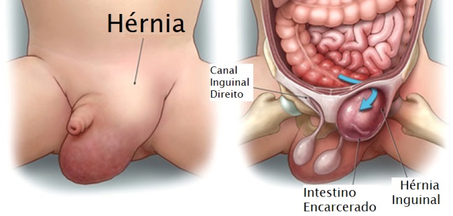 Uma hérnia inguinal é a passagem de parte do intestino através de uma abertura anormal na região da virilha. É muito comum nos meninos e mais frequente do lado direito, podendo ocorrer em ambos os lados.