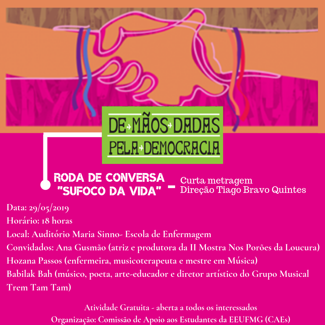 Na próxima quarta-feira, 29 de maio, às 18 horas, será realizada no auditório Maria Sinno da Escola de Enfermagem da UFMG a roda de conversa “Sufoco da Vida”. A atividade faz parte da VII Semana de Saúde Mental, é organizada pela Comissão de Apoio ao Estudante (CAEs), gratuita, aberta ao público e sem necessidade de inscrição prévia.
