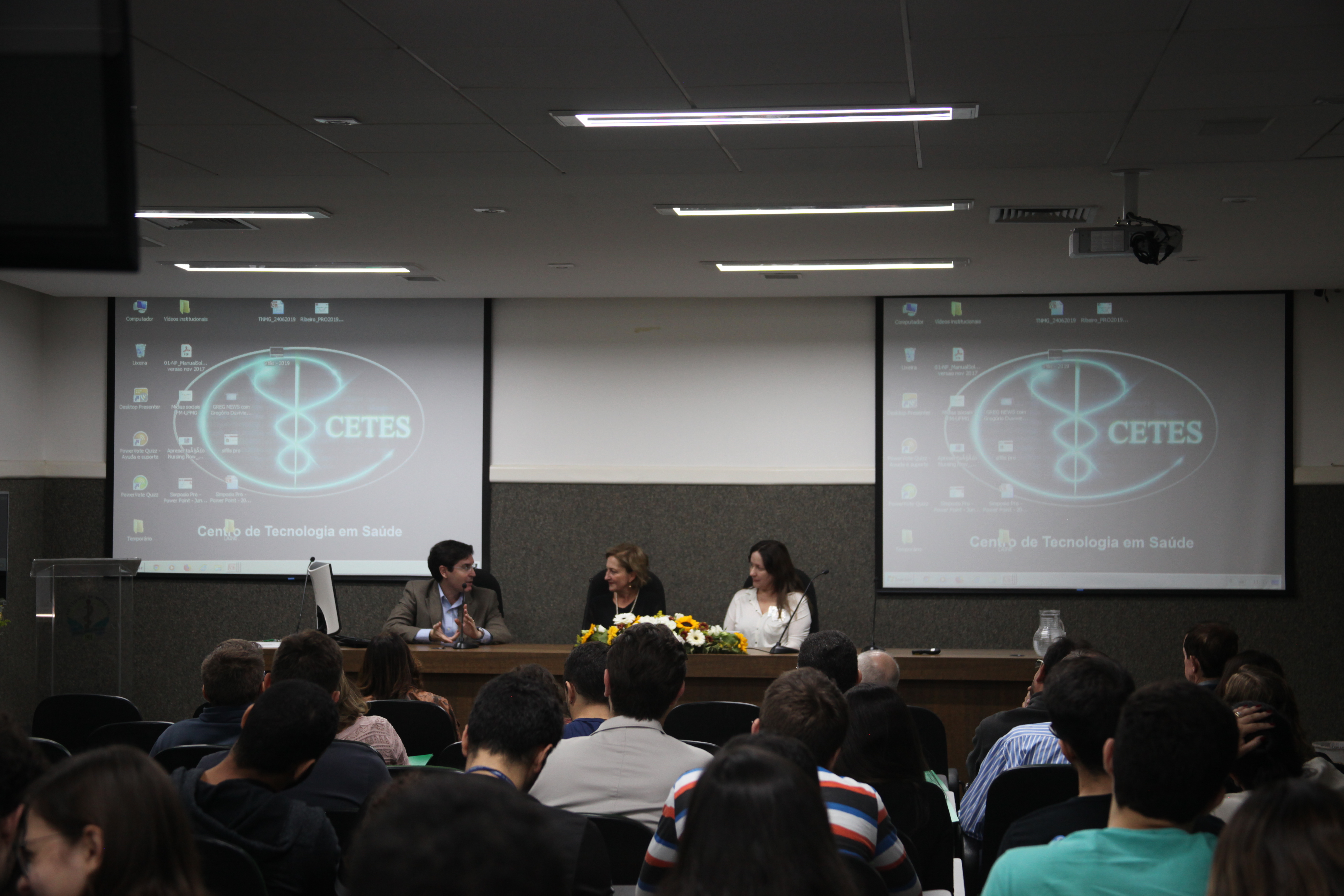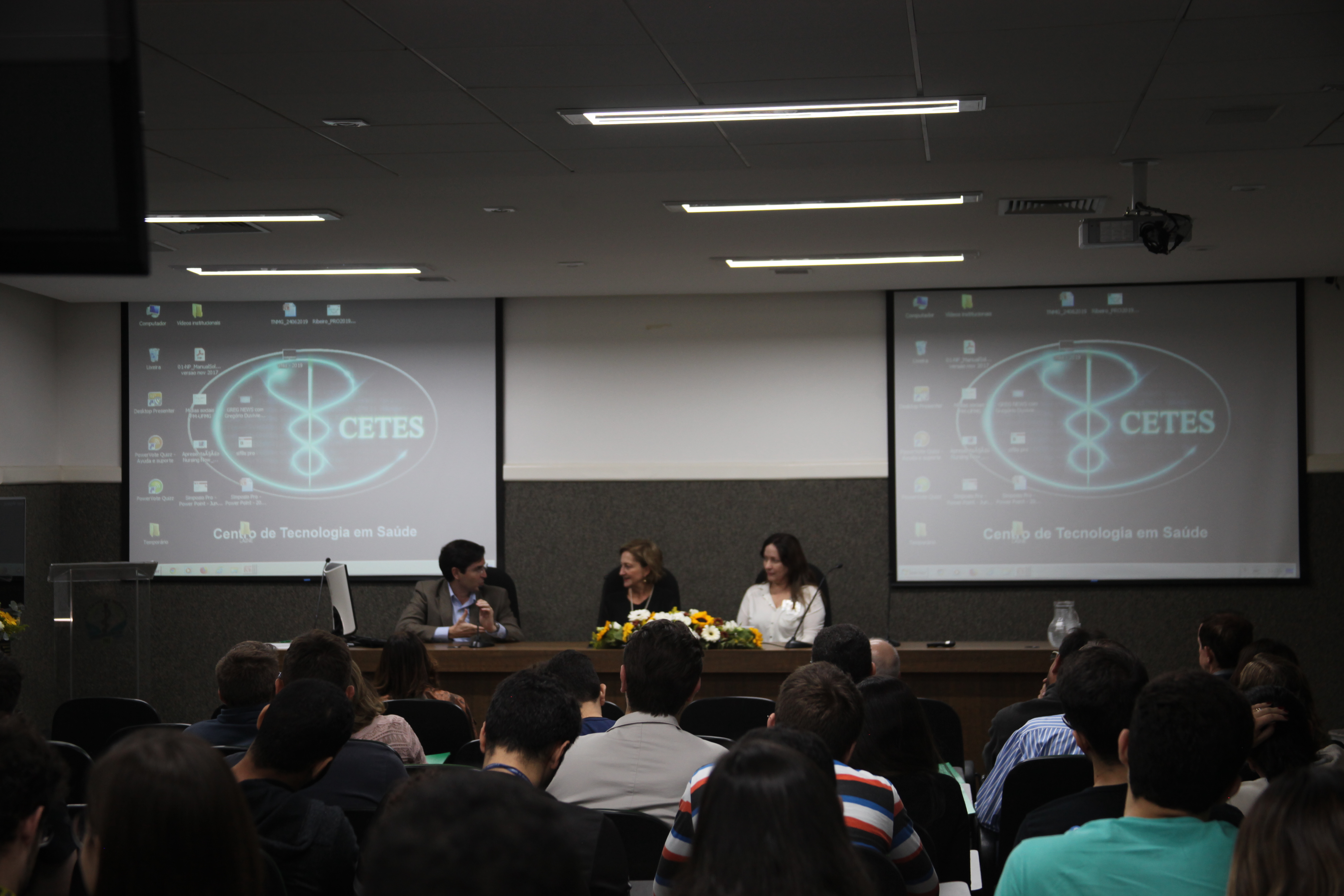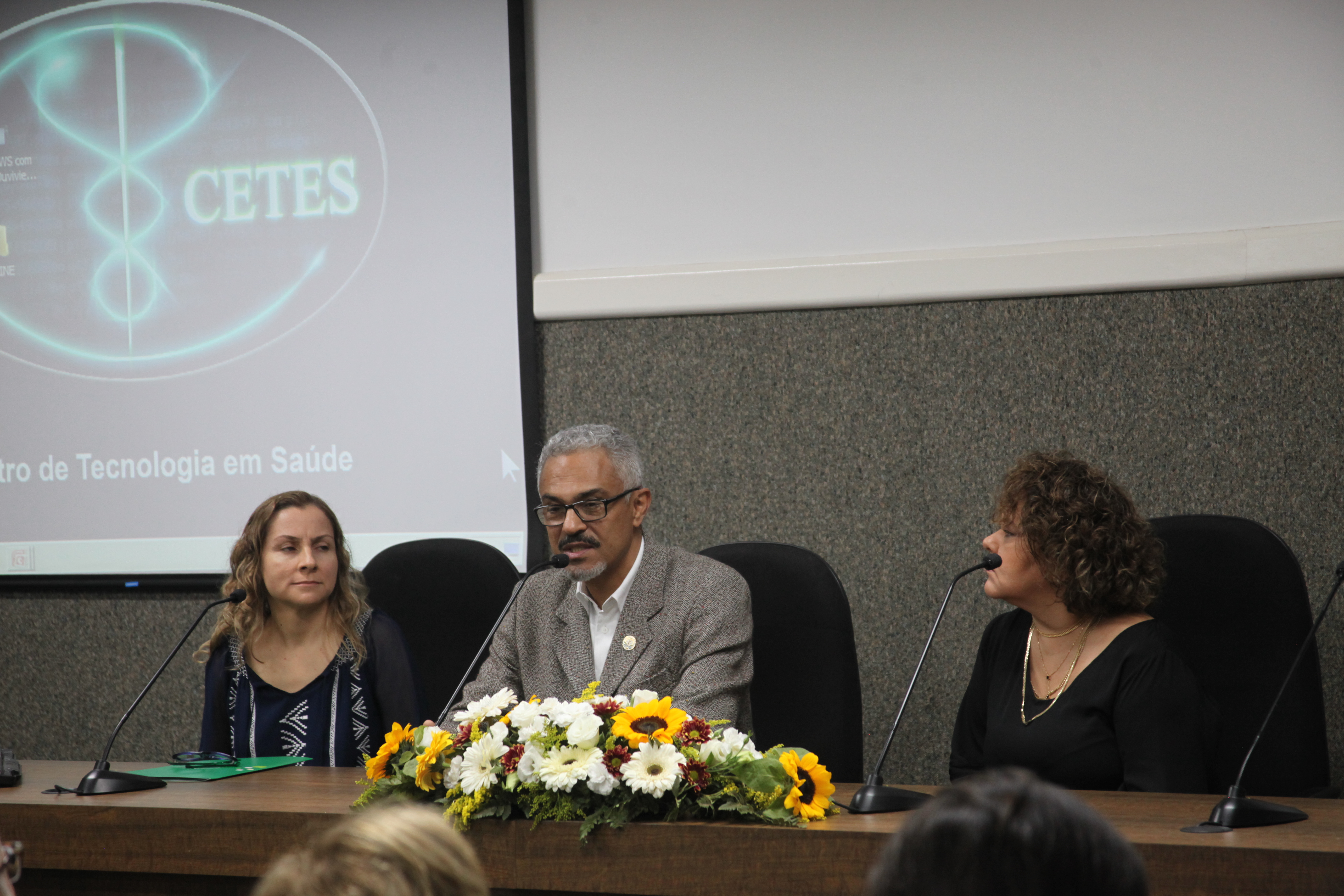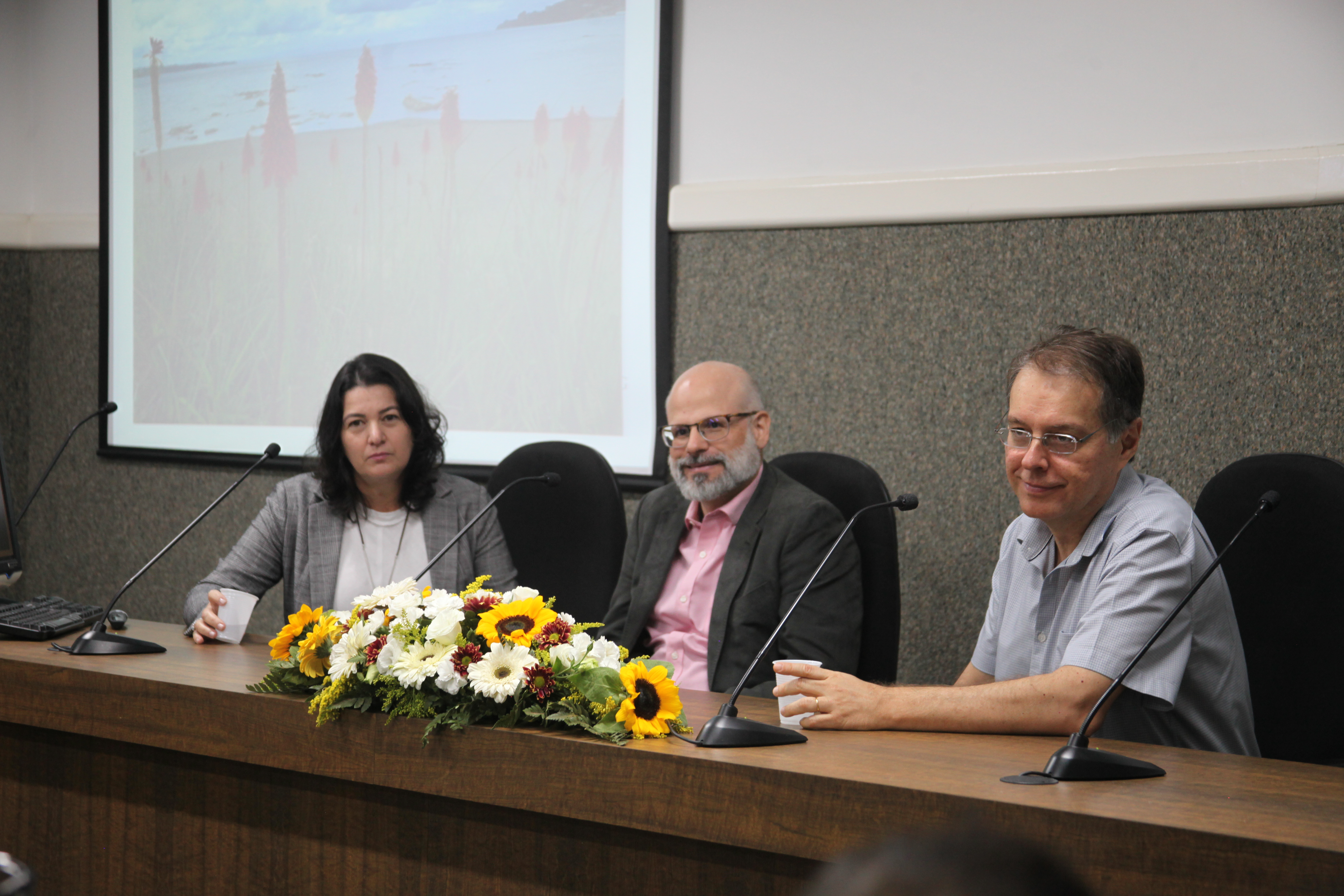 Mesa de abertura: professora Sandra Guerra (Chefe do Departamento), professor Humberto José Alves, professora Luciana de Gouvea (Subchefe do Departamento)
