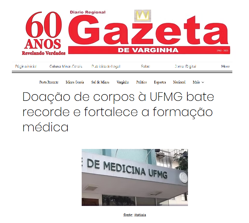 Gazeta Varginha – Doação de corpos à UFMG bate recorde e fortalece a formação médica Published 19 de janeiro de 2026 at 820 × 732 in Saiu na mídia Doação de corpos à UFMG bate recorde e fortalece a formação médica https://www.gazetadevarginha.com.br/post/doa%C3%A7%C3%A3o-de-corpos-%C3%A0-ufmg-bate-recorde-e-fortalece-a-forma%C3%A7%C3%A3o-m%C3%A9dica