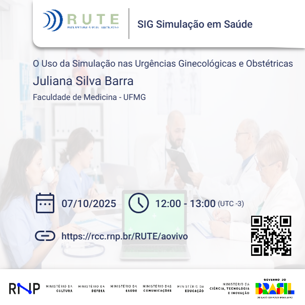 A Faculdade de Medicina da UFMG e a Rede Universitária de Telemedicina (RUTE) promovem a WebConferência: “O uso da simulação nas urgências ginecológicas e obstétricas”, ministrada pela Professora Juliana Barra, Faculdade de Medicina-UFMG. O evento acontece no dia 07 de outubro de 2025 de 12 às13h.